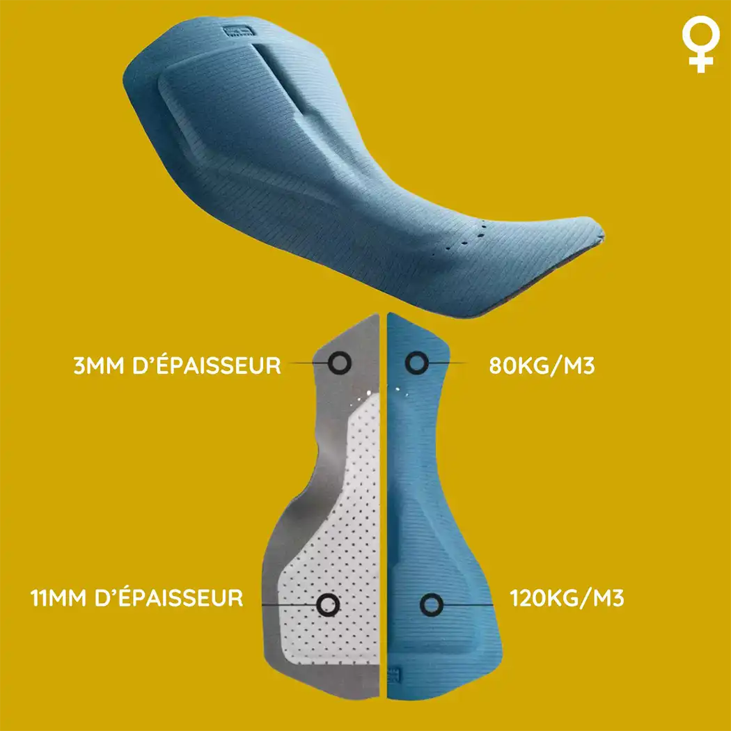 La peau de Chamois est fournie par l'entreprise Elastic Interface en Italie, société leader sur le marché. Elle est spécifique à la morphologie des femmes et vous apporte un confort pendant 6H. Elle est large et épaisse, respirante avec des points d'aération et creusée au centre pour le périnée.